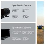 Met een kijkhoek van 170 graden en een helderheid van 500 cd/m² heb je altijd een goed afleesbaar beeld, ook bij zonlicht. Het nachtzicht werkt tot 8 meter, waardoor achteruitrijden ook in het donker veilig blijft. Dankzij de IP69K-waterdichte behuizing is de camera bestand tegen extreme weersomstandigheden en schoonspuiten. Het brede spanningsbereik van 1224V maakt de set geschikt voor vrijwel elk type auto.