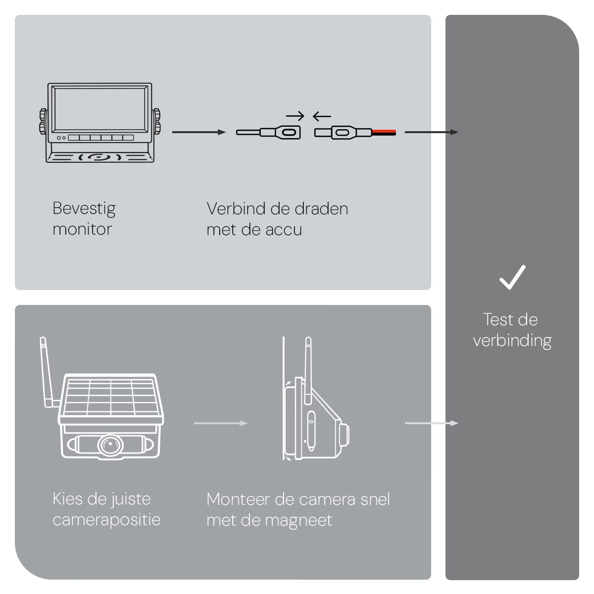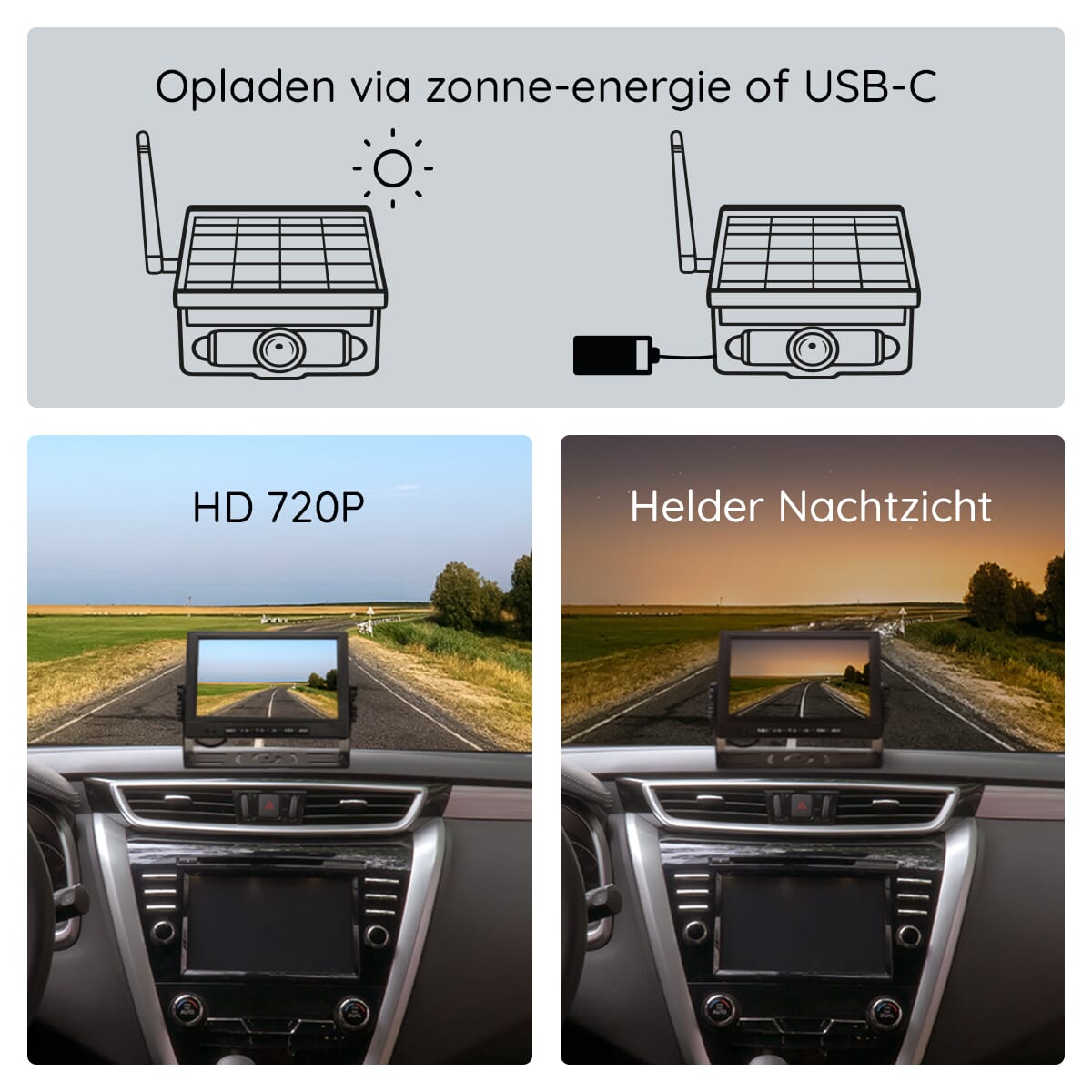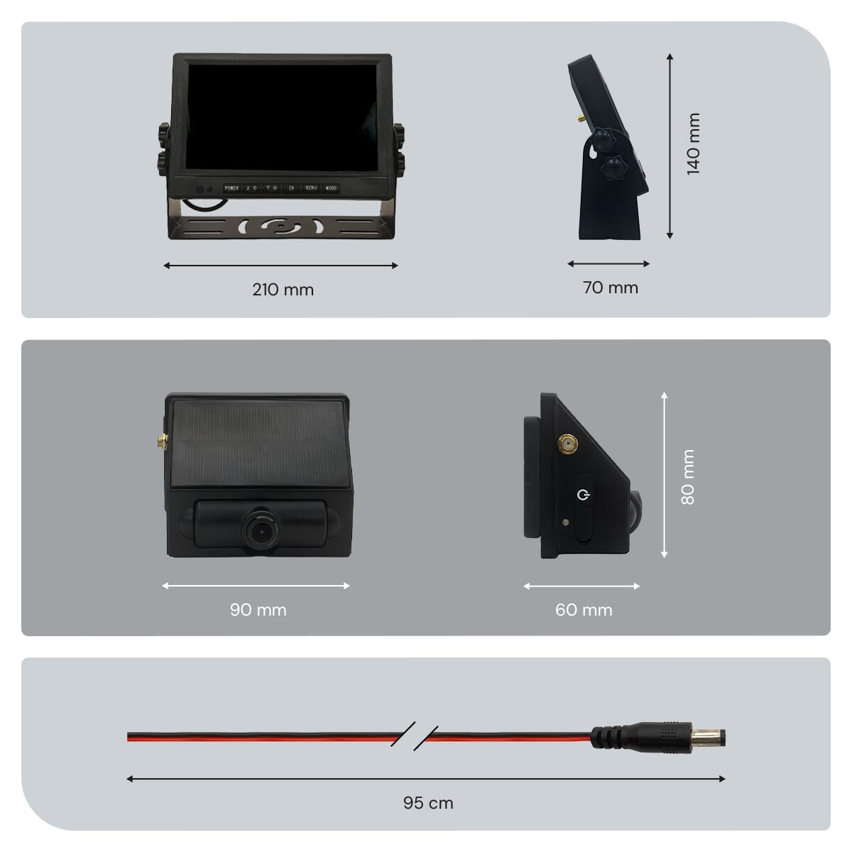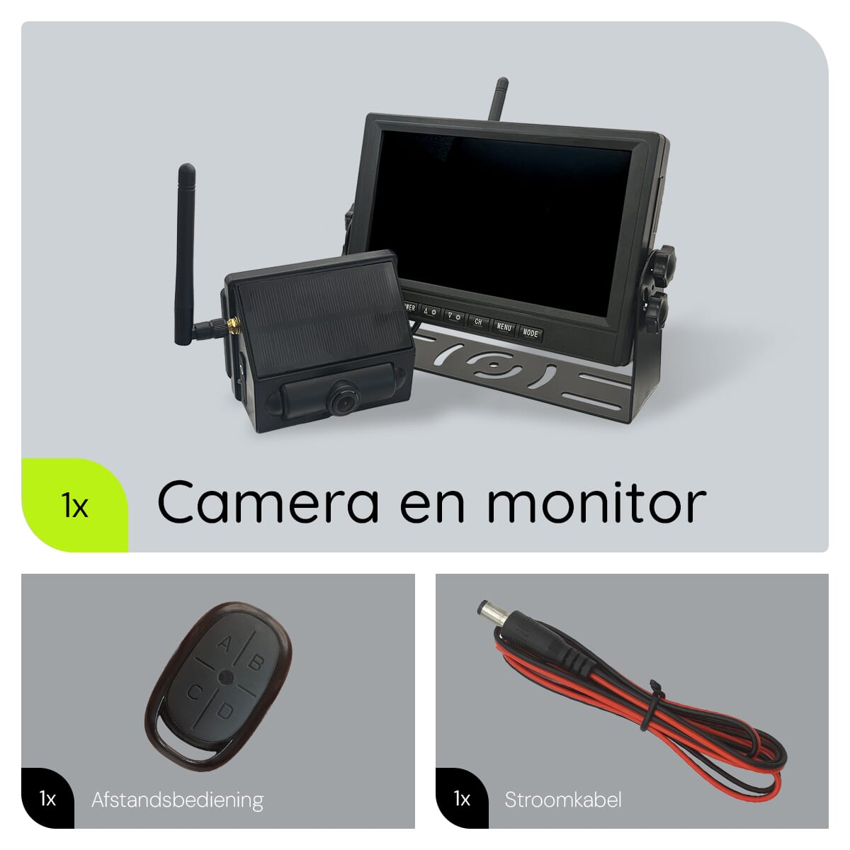 De camera werkt op zonne-energie en is draadloos verbonden met het scherm, waardoor je geen lange kabels hoeft te trekken. Het scherm sluit je aan op stroom en het systeem is direct klaar voor gebruik.