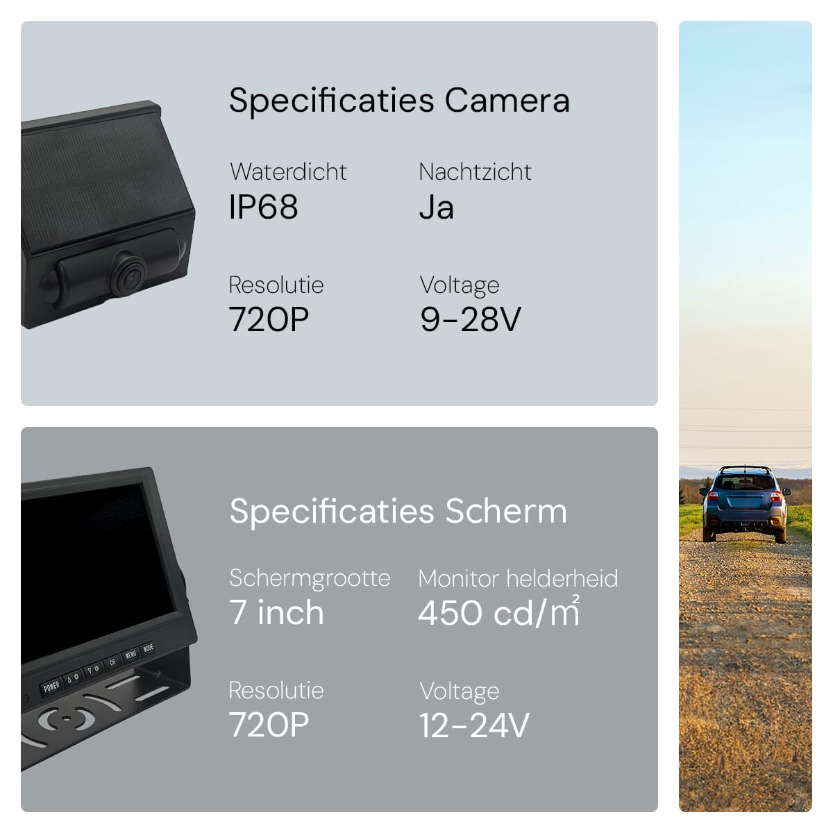 Met een kijkhoek van 160 graden en een helderheid van 450 cd/m² heb je altijd een goed afleesbaar beeld, ook bij zonlicht. Het nachtzicht zorgt voor veilig achteruitrijden in het donker. De draadloze verbinding werkt tot 200 meter in open veld (circa 50 meter met obstakels) en is geschikt voor vrijwel elk type voertuig. Dankzij de IP68-waterdichte behuizing is de camera bestand tegen stof en regen. Het brede spanningsbereik van 1224V maakt de set geschikt voor auto, bus, vrachtwagen en camper.