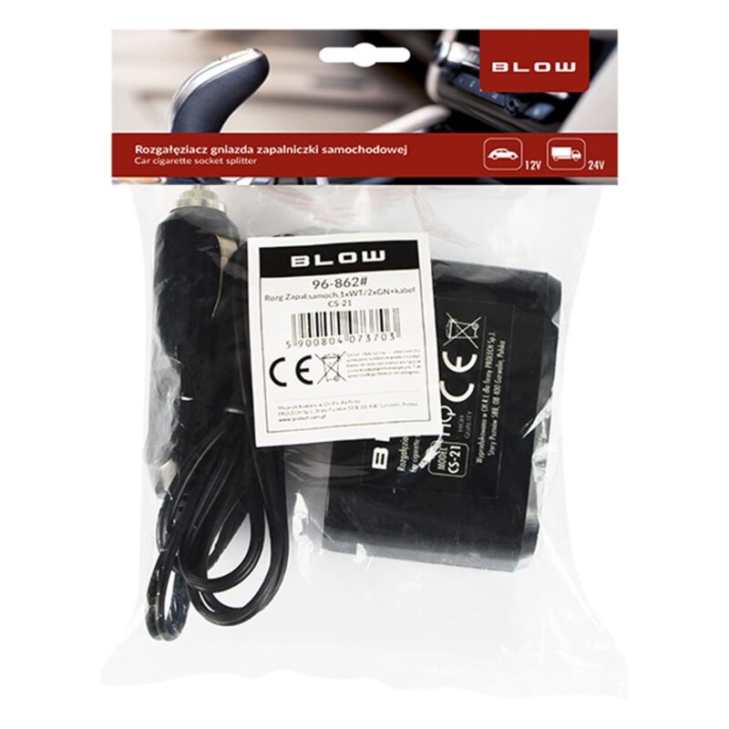 BLOW Auto Sigarettenaansteker Splitter – 2x Socket – CS-21 – 12V/24V – Met Kabel & LED-indicator