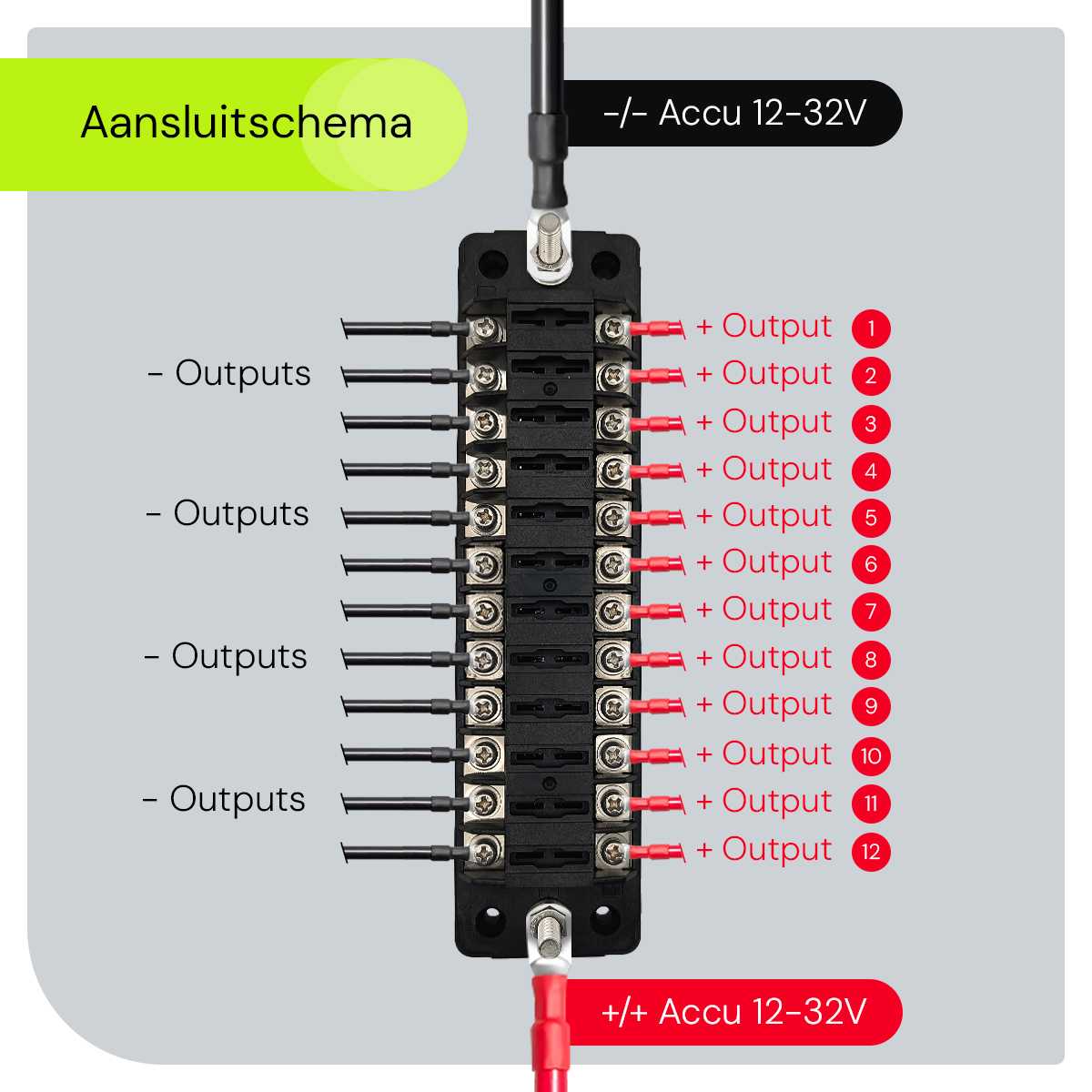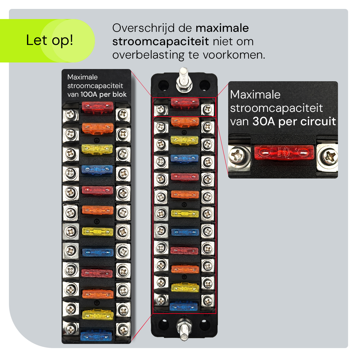 - Let op de maximale stroomcapaciteit van 100A per blok en 30A per circuit om overbelasting te voorkomen.