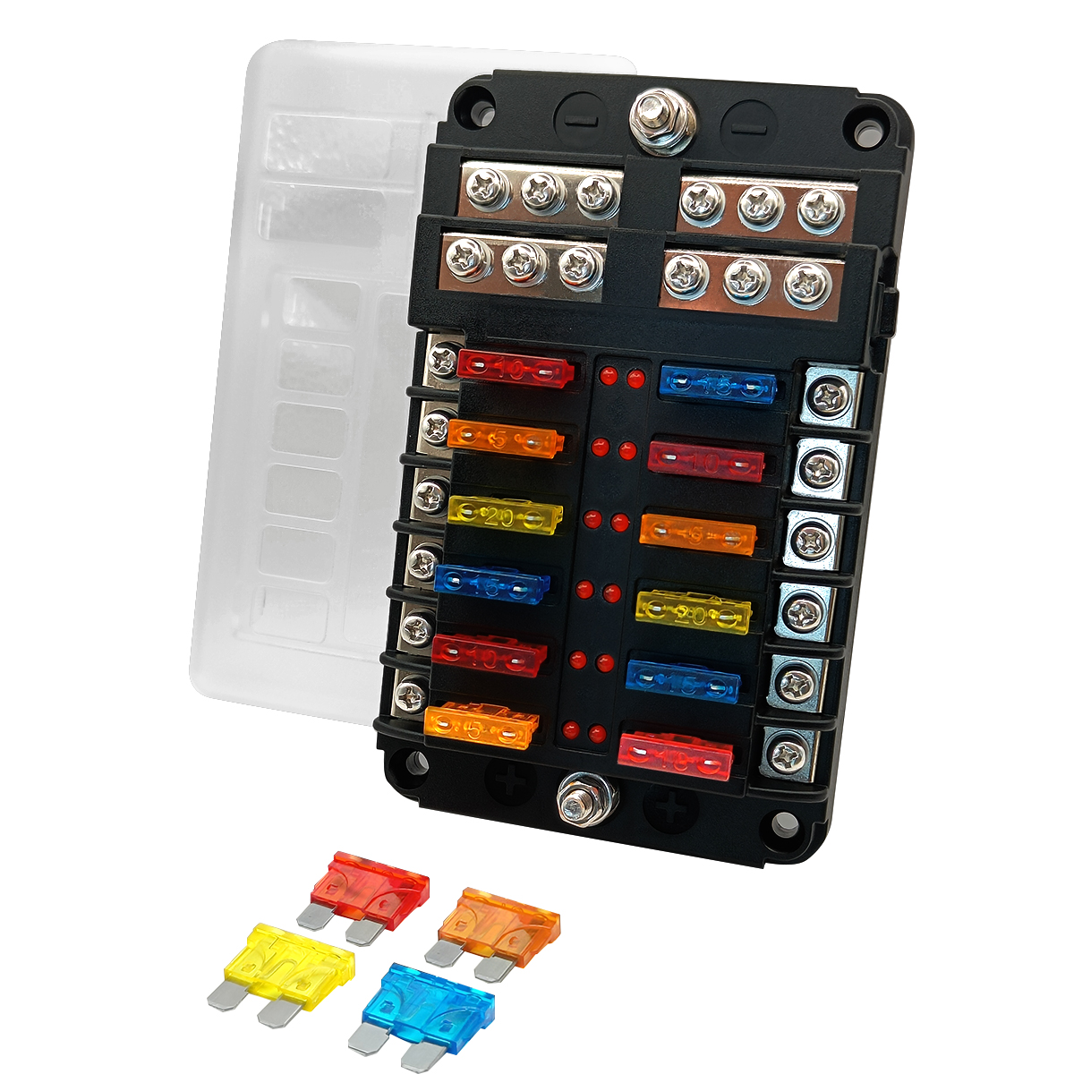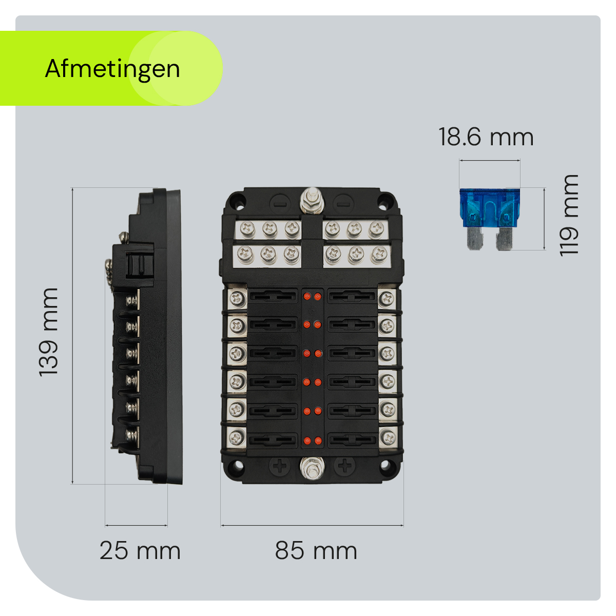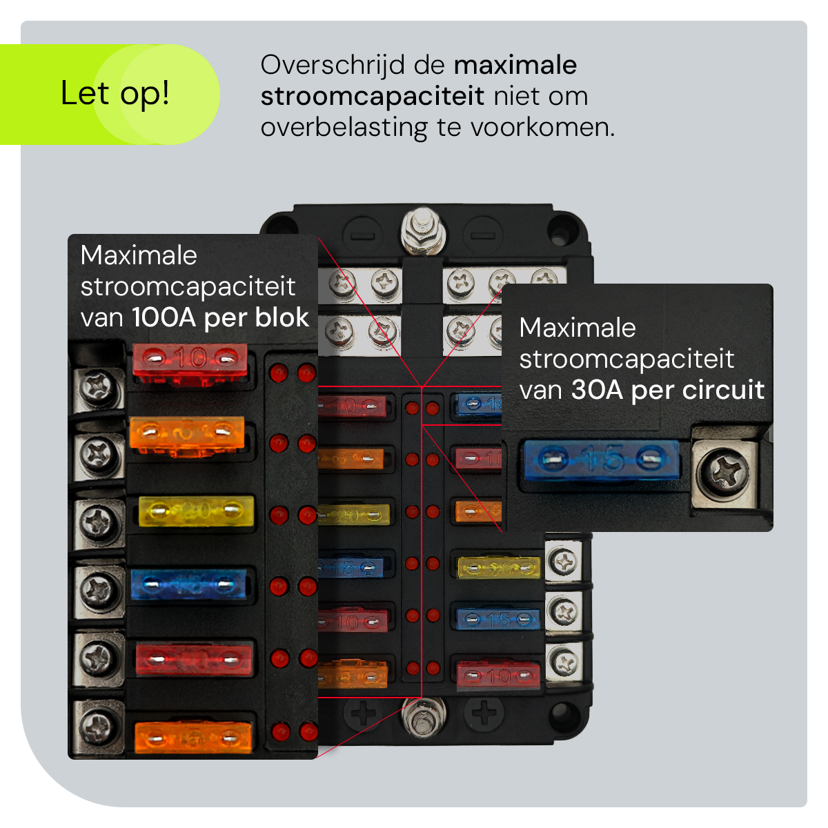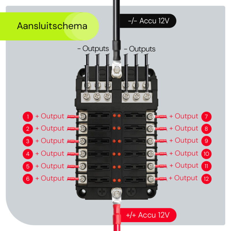 - 12-voudige capaciteit: Biedt voldoende ruimte voor het aansluiten van meerdere elektrische circuits en accessoires, waardoor je flexibiliteit hebt bij het opzetten van je elektrische systeem.