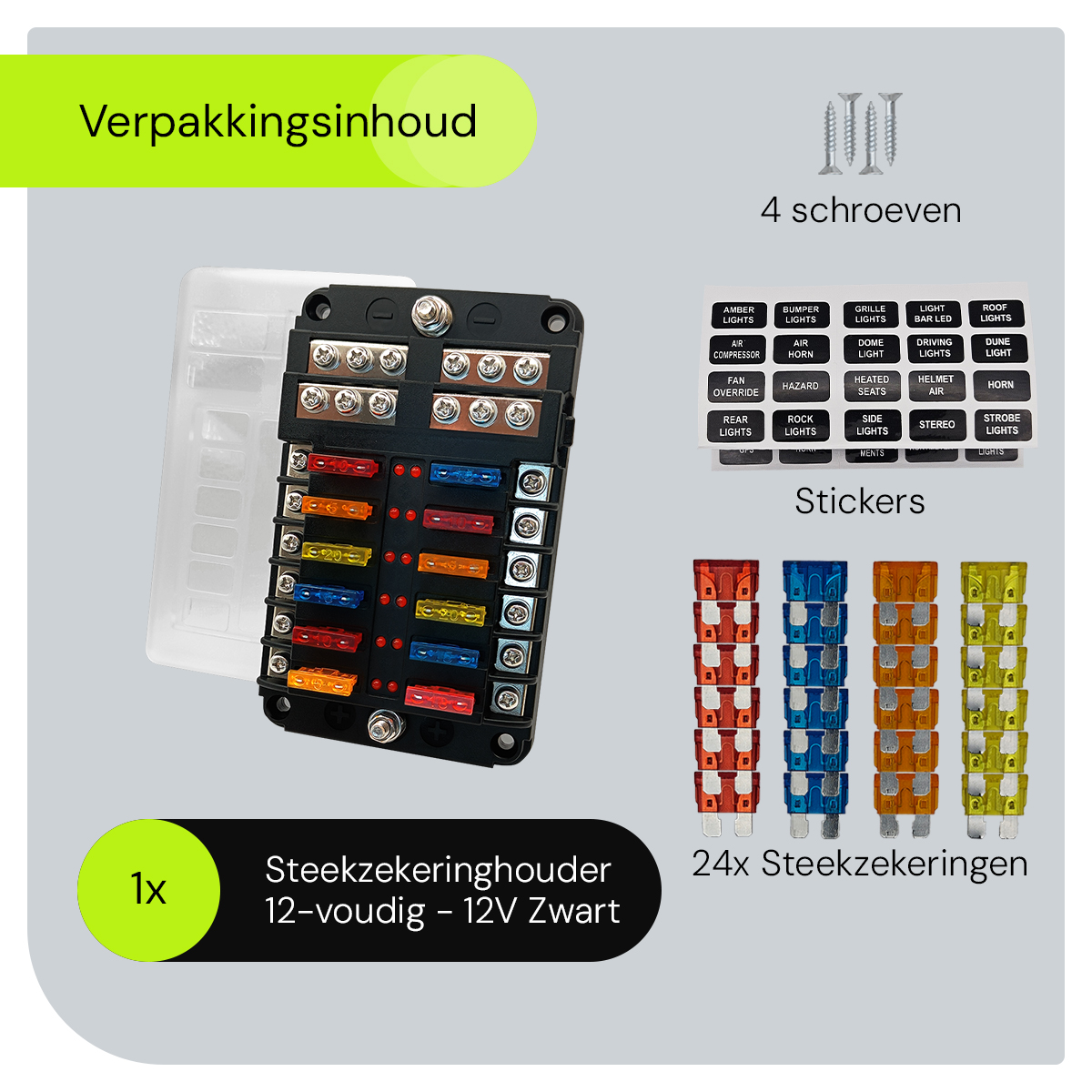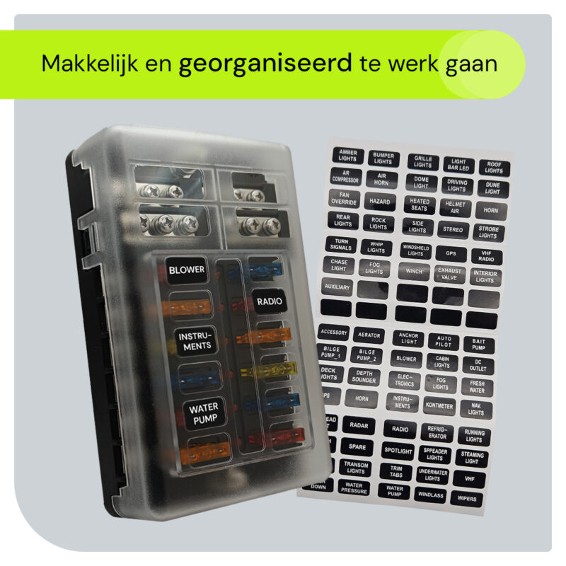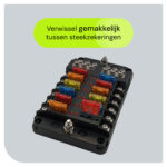 - Inclusieve steekzekeringen: Wordt geleverd met een assortiment steekzekeringen voor verschillende stroombehoeften, waardoor je direct aan de slag kunt met je installatie.