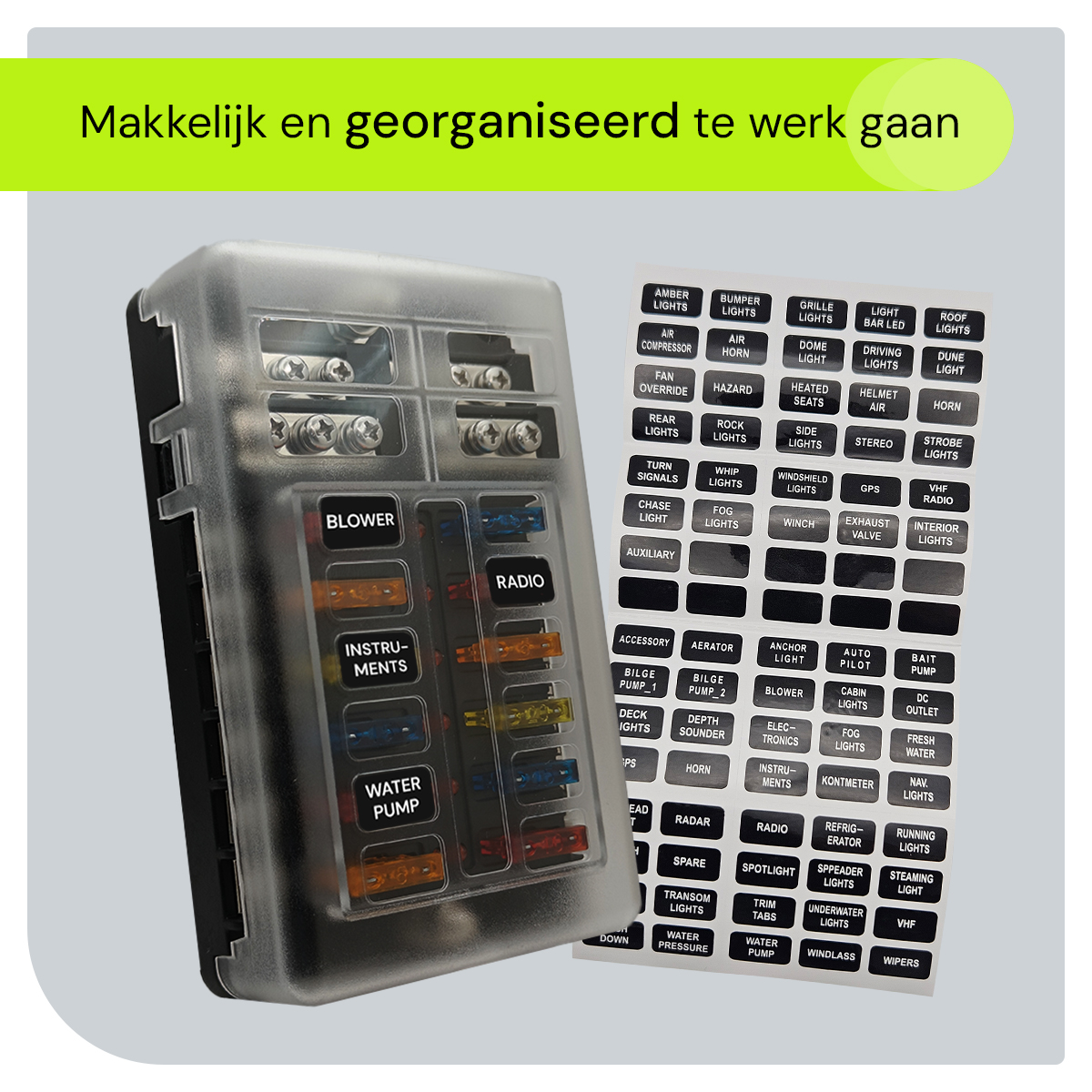 - Sluit je elektrische circuits en accessoires aan op de juiste aansluitingen op de zekeringhouder.