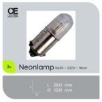 De miniatuur signaallamp werkt op een spanning van 230V en is eenvoudig te installeren in een BA9S fitting. De neonlamp technologie zorgt voor een efficiënte en betrouwbare lichtopbrengst.