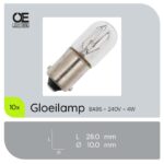 De miniatuur signaallamp BA9S is een compacte gloeilamp ontworpen voor gebruik in diverse apparatuur en instrumentpanelen. Met een vermogen van 4W en een spanning van 240V, biedt deze lamp een betrouwbare lichtoplossing voor indicatorlampjes. De lamp heeft een diameter van 10mm en een lengte van 28mm, waardoor hij geschikt is voor kleine ruimtes.