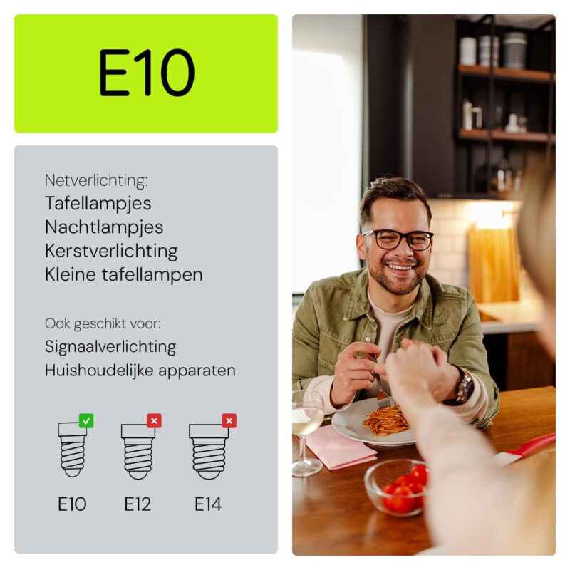 De miniatuur signaallamp E10 is een compacte gloeilamp die geschikt is voor diverse toepassingen zoals apparatuur, instrumentpanelen en indicatorlampjes. Met een diameter van 10 mm en een lengte van 28 mm, biedt deze lamp een warm wit licht van 2500K. De lamp is dimbaar, waardoor het mogelijk is om de lichtintensiteit aan te passen aan de specifieke behoeften van de gebruiker.