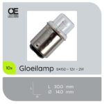 De OE Lightning Signaallamp Ba15d 12V 2W is een compacte en efficiënte gloeilamp, ontworpen voor diverse toepassingen zoals navigatieverlichting, dashboards, trucks en maritieme toepassingen. Met een diameter van 14 mm en een lengte van 30 mm, biedt deze lamp een warm wit licht van 2500K, wat zorgt voor een aangename en heldere verlichting.