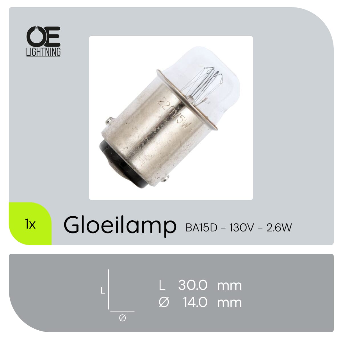 De Signaallamp Ba15d 130V 2.6W is een compacte gloeilamp ontworpen voor gebruik in diverse apparaten en industriële toepassingen. Met een diameter van 14 mm en een lengte van 30 mm, biedt deze lamp een warm wit licht van 2500K, ideaal voor signaalverlichting en andere specifieke toepassingen.