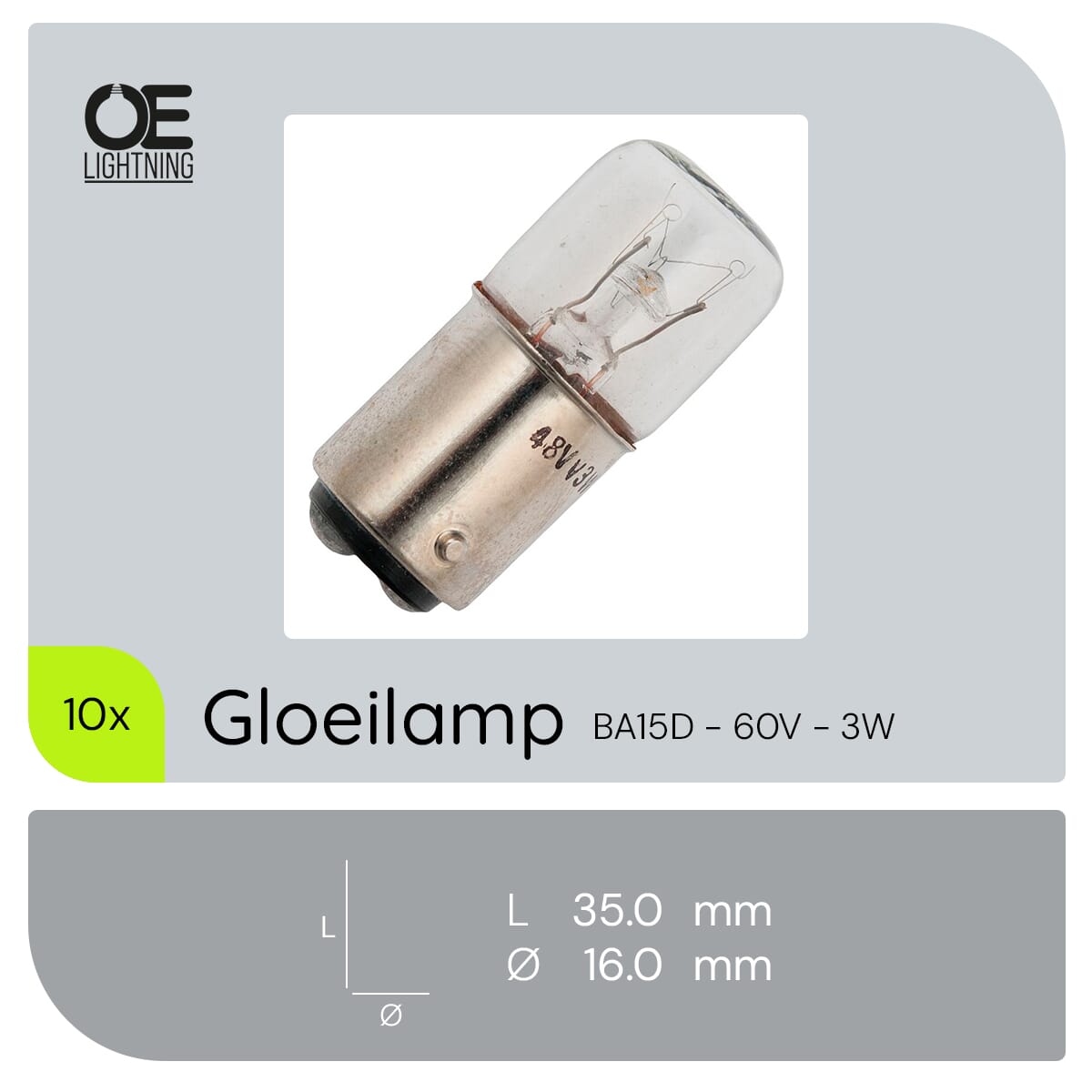 De Signaallamp Ba15d 60V 3W is een compacte en efficiënte lichtbron, ontworpen voor gebruik in diverse apparaten en industriële toepassingen. Deze gloeilamp biedt warm wit licht met een kleurtemperatuur van 2500K, wat zorgt voor een aangename en functionele verlichting. Met een diameter van 16mm en een lengte van 35mm is deze lamp geschikt voor signaalverlichting en andere specifieke toepassingen.