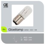 De Signaallamp Ba15d 60V 5W is een compacte en efficiënte gloeilamp, ontworpen voor gebruik in diverse apparaten en industriële toepassingen. Met een diameter van 16 mm en een lengte van 45 mm, biedt deze lamp een warm wit licht van 2500K, ideaal voor signaalverlichting en andere specifieke toepassingen.