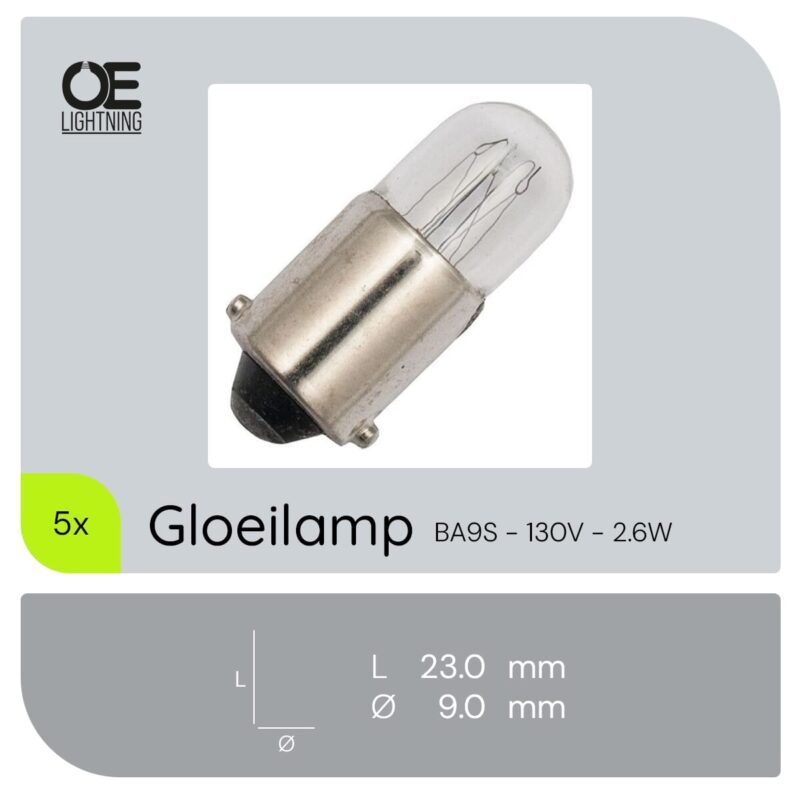 De Signaallamp Ba9s 130V 2.6W is een compacte gloeilamp ontworpen voor gebruik in diverse apparaten en industriële toepassingen. Met een diameter van 9 mm en een lengte van 23 mm is deze lamp ideaal voor signaalverlichting en andere specifieke toepassingen waar ruimte beperkt is. De lamp straalt een warm wit licht uit met een kleurtemperatuur van 2500K, wat zorgt voor een aangename en herkenbare verlichting.