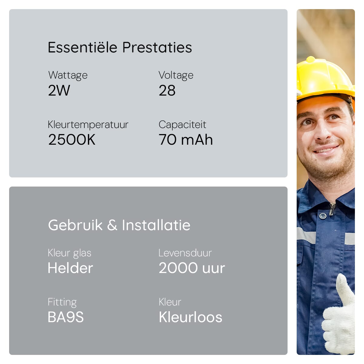 De Signaallamp Ba9s 28V 2W is een compacte en efficiënte lichtbron, ontworpen voor gebruik in industriële toepassingen, vrachtwagens en boten. Deze lamp biedt een warm wit licht van 2500K en is dimbaar, waardoor het geschikt is voor diverse omgevingen waar aanpasbare verlichting gewenst is. Met een diameter van 10mm en een lengte van 28mm past deze lamp in kleine ruimtes.