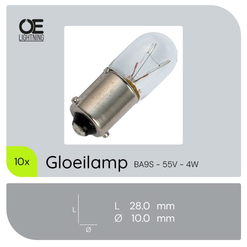 De Signaallamp Ba9s 55V 4W is een compacte en efficiënte lichtbron, ontworpen voor gebruik in diverse apparaten en industriële toepassingen. Deze lamp biedt warm wit licht met een kleurtemperatuur van 2500K, wat zorgt voor een aangename en heldere verlichting. Met een diameter van 10 mm en een lengte van 28 mm is deze lamp geschikt voor signaalverlichting en andere specifieke toepassingen.