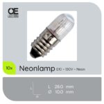 De signaallamp E10 130V is een T10 neonlamp met een diameter van 10 mm en een lengte van 28 mm. Deze lamp is ontworpen voor gebruik in apparaten, signaalverlichting en industriële toepassingen. Met een kleurtemperatuur van 2500K straalt de lamp een warm wit licht uit, wat ideaal is voor omgevingen waar een zachte en aangename verlichting gewenst is.