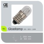 De Signaallamp E10 is een compacte gloeilamp ontworpen voor diverse toepassingen, waaronder apparaten, signaalverlichting en industriële toepassingen. Met een diameter van 9 mm en een lengte van 23 mm biedt deze lamp een efficiënte oplossing voor situaties waar ruimte beperkt is. De lamp straalt een warm wit licht uit met een kleurtemperatuur van 2500K, wat zorgt voor een aangename verlichting.
