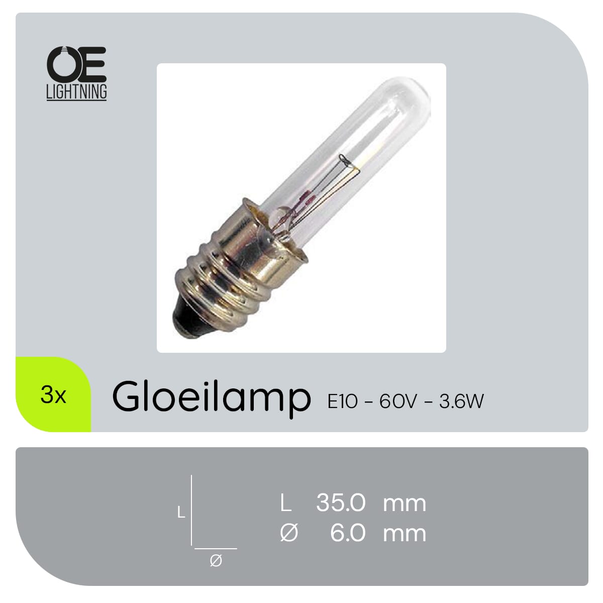 De signaallamp E10 60V 3.6W is een compacte gloeilamp ontworpen voor gebruik in diverse apparaten en industriële toepassingen. Met een diameter van 6.6 mm en een lengte van 35 mm, biedt deze lamp een warm wit licht van 2500K, ideaal voor signaalverlichting en andere specifieke toepassingen.