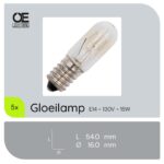 De signaallamp E14 130V 15W is een compacte gloeilamp ontworpen voor diverse toepassingen zoals apparaten, signaalverlichting en industriële omgevingen. Met een diameter van 16 mm en een lengte van 54 mm, biedt deze lamp een warm wit licht van 2500K, wat zorgt voor een aangename en functionele verlichting. Deze lamp is dimbaar, waardoor de lichtintensiteit naar wens kan worden aangepast.