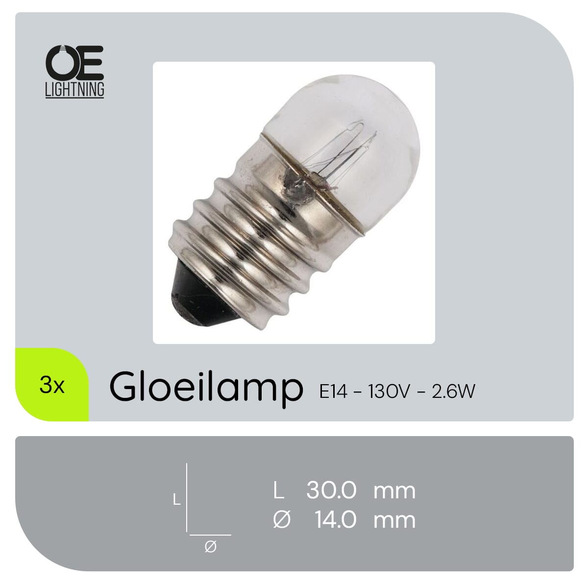 De Signaallamp E14 130V 2.6W is een compacte en efficiënte lichtbron, ontworpen voor gebruik in apparaten, signaalverlichting en industriële toepassingen. Met een diameter van 14 mm en een lengte van 30 mm, biedt deze T14 gloeilamp een warm wit licht van 2500K, wat zorgt voor een aangename en functionele verlichting.