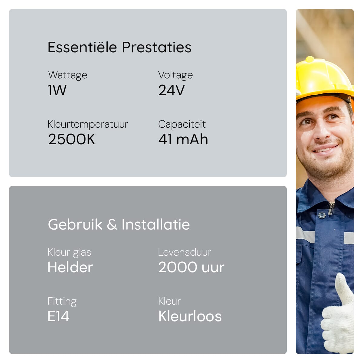 De signaallamp E14 24V 1W is een compacte en efficiënte lichtbron, ontworpen voor gebruik in industriële toepassingen, vrachtwagens en boten. Met een diameter van 14 mm en een lengte van 30 mm, biedt deze gloeilamp warm wit licht van 2500K, wat zorgt voor een aangename en functionele verlichting. De lamp is dimbaar, waardoor de lichtintensiteit naar wens kan worden aangepast.