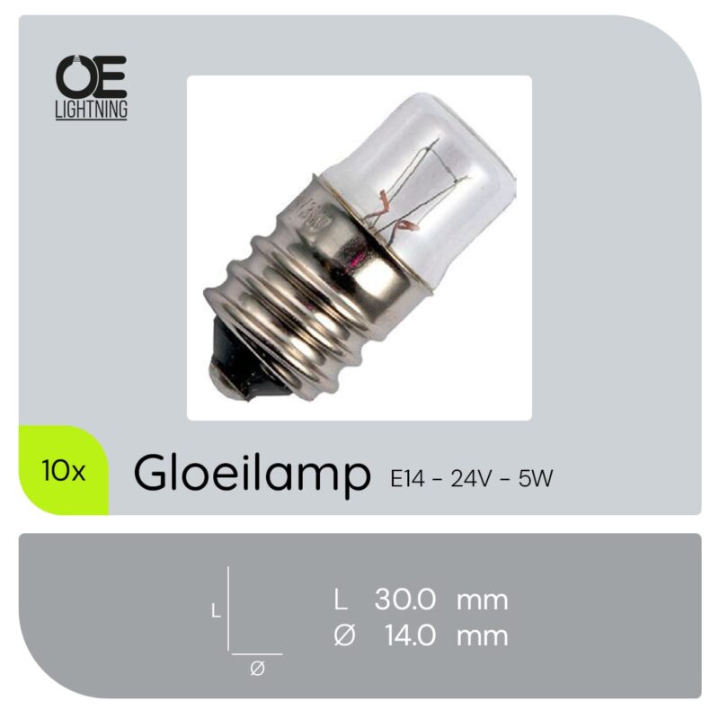 De signaallamp E14 24V 5W is een compacte en efficiënte lichtbron, ontworpen voor gebruik in industriële toepassingen, vrachtwagens en boten. Deze T14 gloeilamp heeft een diameter van 14 mm en een lengte van 30 mm, waardoor hij geschikt is voor installaties met beperkte ruimte. Het warm witte licht van 2500K zorgt voor een aangename verlichting.