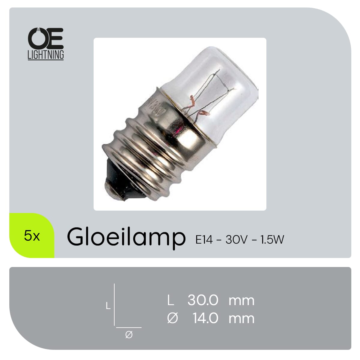 De signaallamp E14 30V 1.5W is een compacte en efficiënte lichtbron, ontworpen voor gebruik in industriële toepassingen, vrachtwagens en boten. Deze lamp biedt een warm wit licht van 2500K, wat zorgt voor een aangename en functionele verlichting. Met een diameter van 14mm en een lengte van 30mm is deze lamp geschikt voor diverse installaties waar ruimte beperkt is.