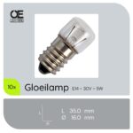 De signaallamp E14 30V 5W is een compacte en efficiënte lichtbron, ontworpen voor gebruik in industriële toepassingen, vrachtwagens en boten. Deze gloeilamp biedt een warm wit licht van 2500K, wat zorgt voor een aangename verlichting in diverse omgevingen. Met een diameter van 16mm en een lengte van 35mm is deze lamp geschikt voor kleine armaturen en krappe ruimtes.
