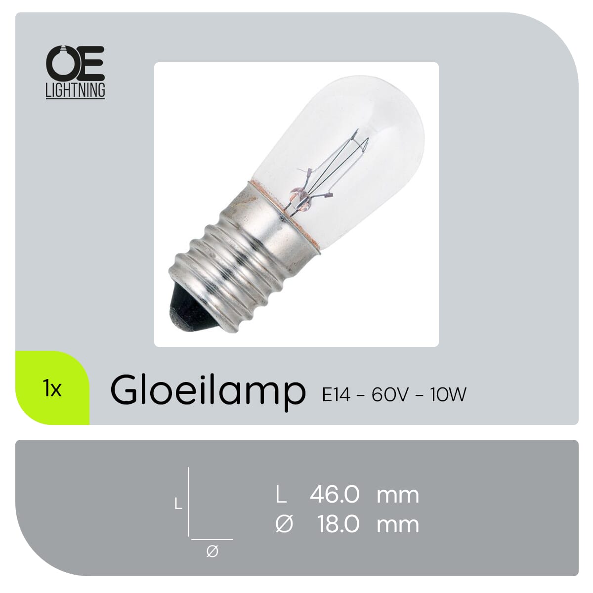 De Signaallamp E14 60V 10W is een compacte gloeilamp ontworpen voor gebruik in diverse apparaten en industriële toepassingen. Met een diameter van 18 mm en een lengte van 46 mm, biedt deze lamp een efficiënte oplossing voor signaalverlichting. De lamp straalt een warm wit licht uit met een kleurtemperatuur van 2500K, wat zorgt voor een aangename en zichtbare verlichting.