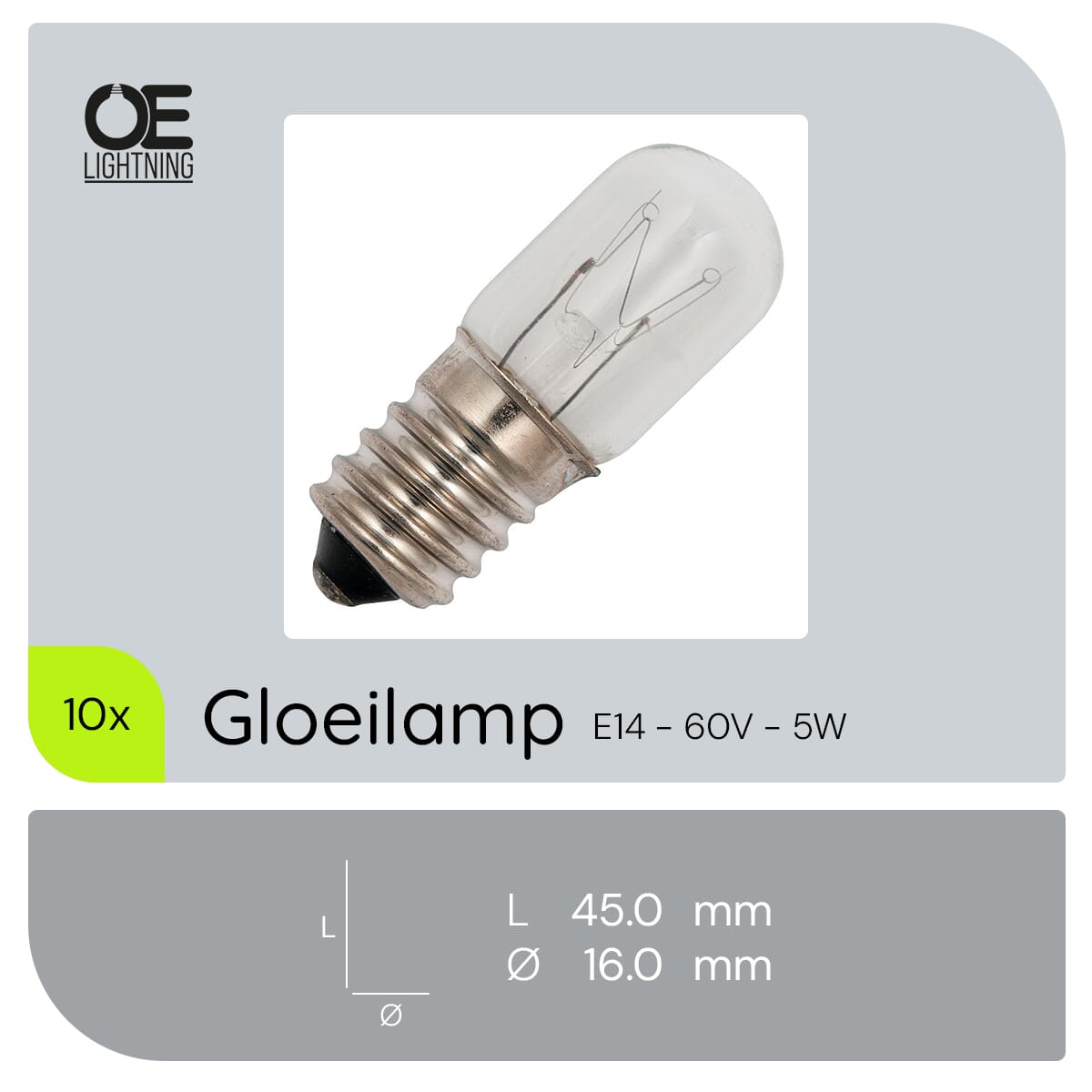 De signaallamp E14 60V 5W is een compacte en efficiënte lichtbron, ontworpen voor gebruik in diverse apparaten, signaalverlichting en industriële toepassingen. Met een diameter van 16 mm en een lengte van 45 mm, biedt deze lamp een warm wit licht van 2500K, wat zorgt voor een aangename en zichtbare verlichting in verschillende omgevingen.