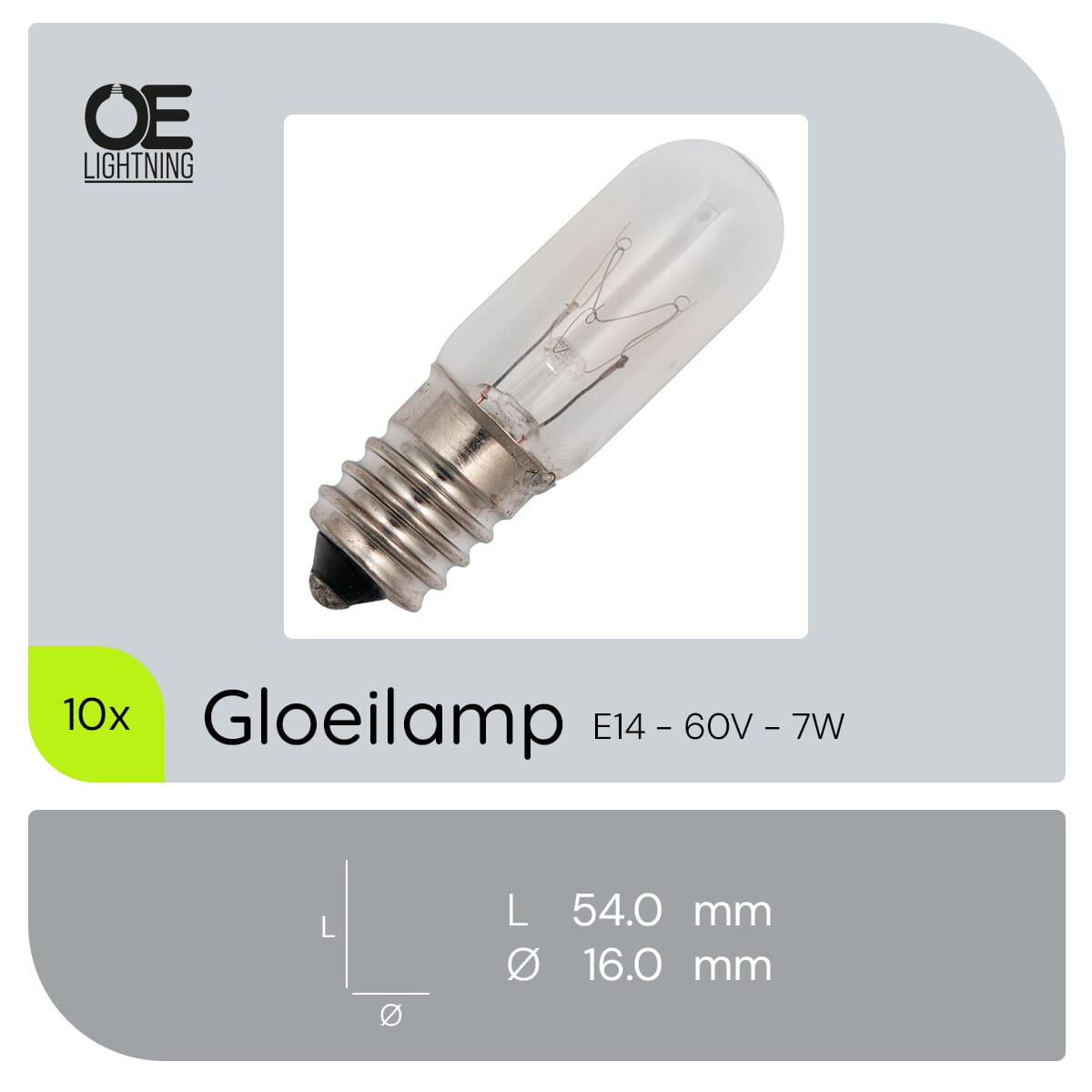 De signaallamp E14 60V 7W is een compacte en efficiënte lichtbron, ontworpen voor gebruik in apparaten, signaalverlichting en industriële toepassingen. Met een diameter van 16 mm en een lengte van 54 mm, biedt deze lamp een warm wit licht van 2500K, wat zorgt voor een aangename en functionele verlichting. Deze lamp is dimbaar, waardoor de lichtintensiteit naar wens kan worden aangepast.