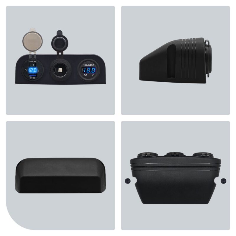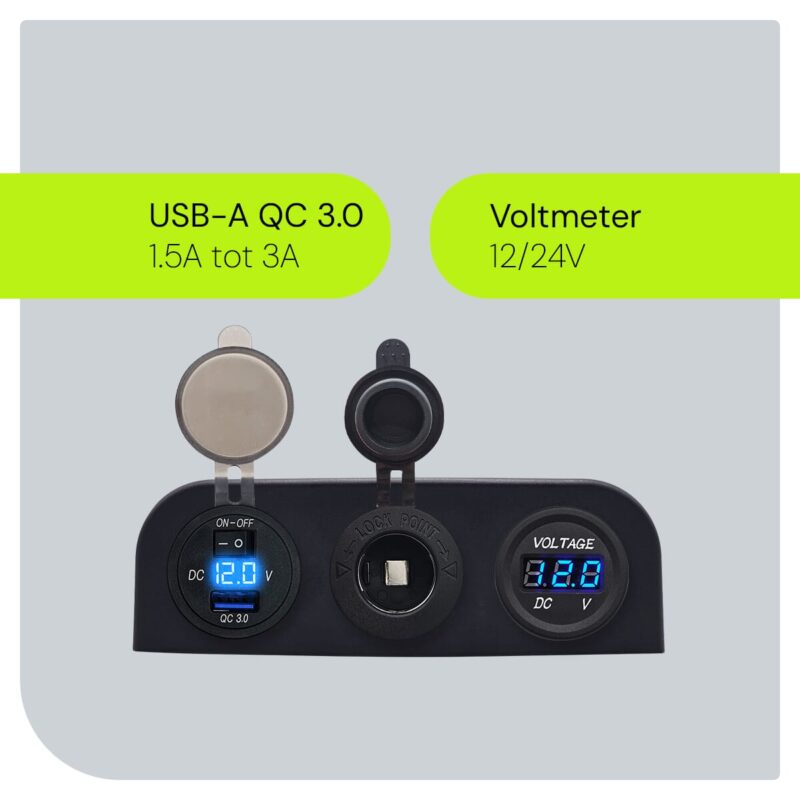 - Extra’s: Voltmeter, schakelaar, 12V/24V sigaretten stopcontact