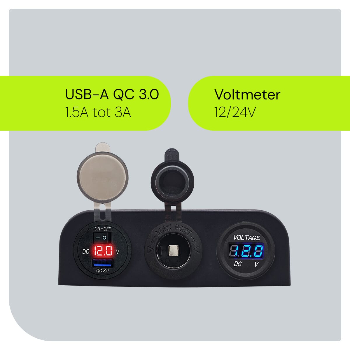 - Extra’s: Voltmeter, schakelaar, 12V/24V sigaretten stopcontact
