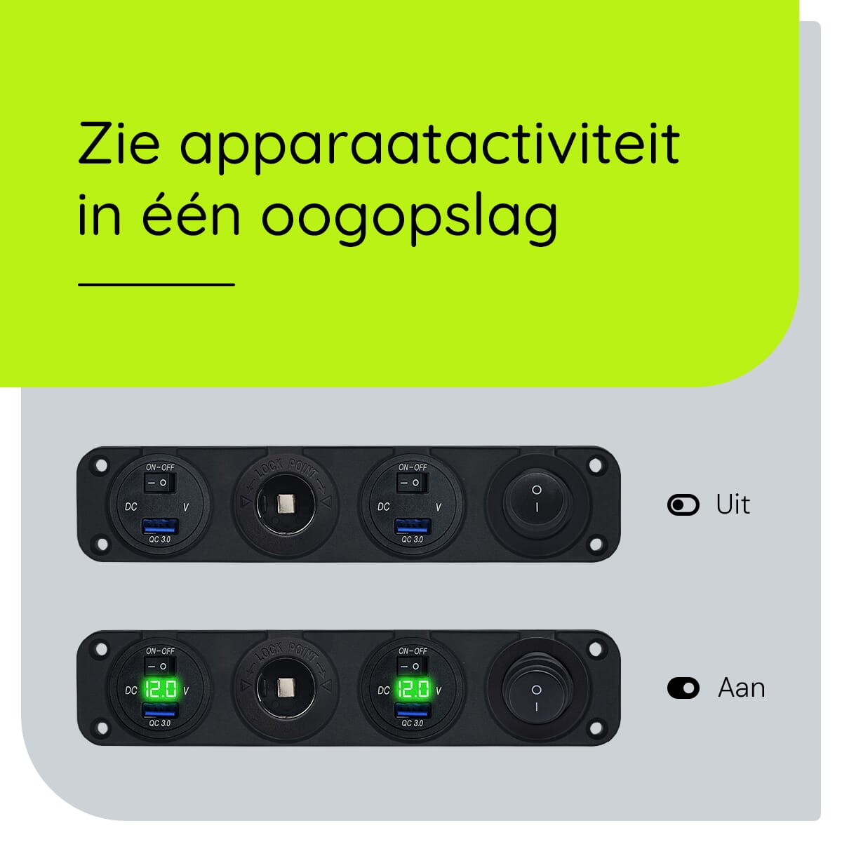 - Meerdere aansluitingen: Laad tot vier apparaten tegelijk op met de dubbele USB-poorten en het 12V sigaretten stopcontact.