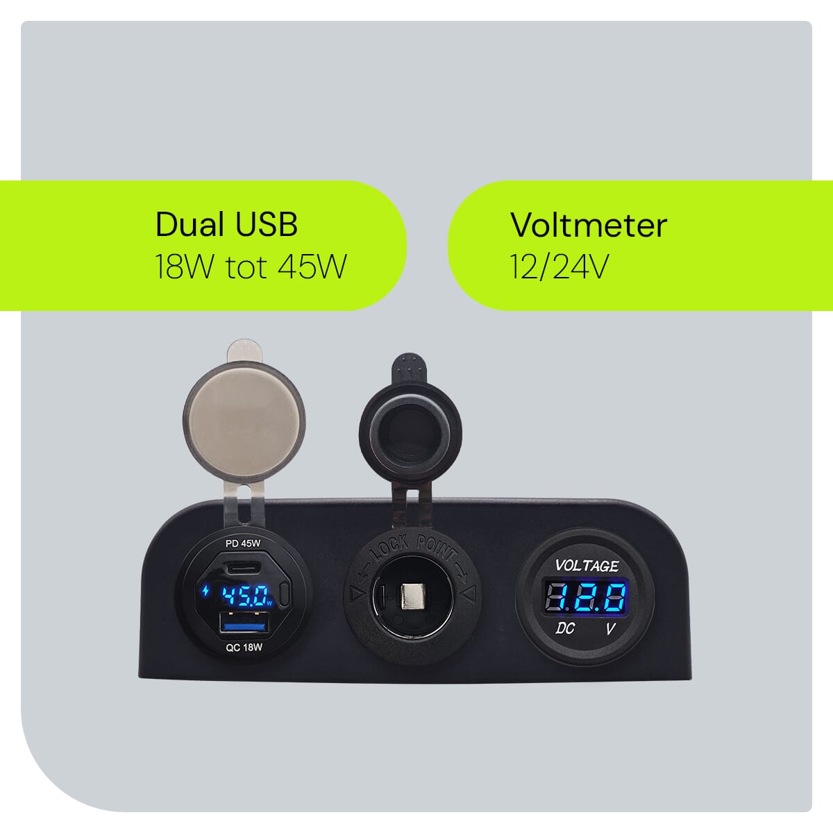 - Extra Functies: Voltmeter, Schakelaar, 12V/24V Sigarettenplug