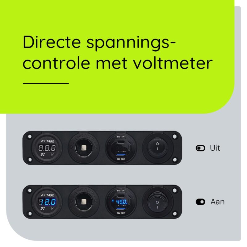 - Extra Functies: Voltmeter, Schakelaar, 12V/24V Sigarettenplug