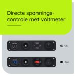 - Extra’s: Aan/Uit schakelaar, Voltmeter en 12V/24V sigaretten stopcontact