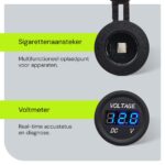 - Extra’s: Aan/Uit schakelaar, Voltmeter en 12V/24V sigaretten stopcontact
