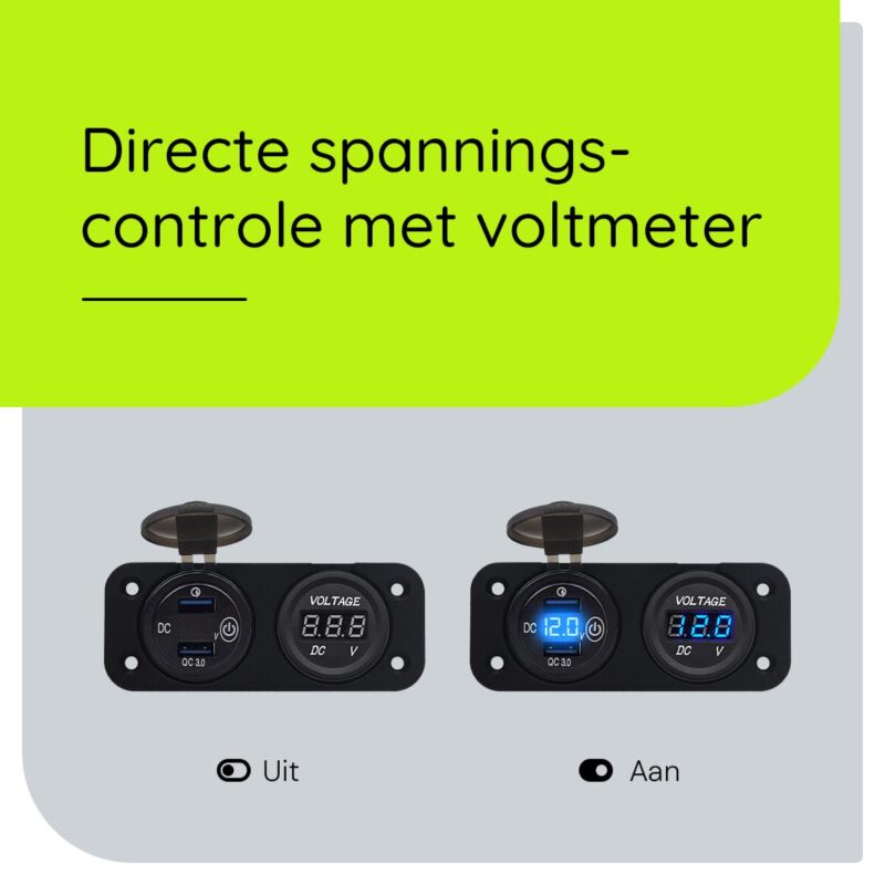 - Veiligheid: De ingebouwde voltmeter en schakelaar zorgen ervoor dat je altijd de controle hebt over je stroomverbruik en de status van je accu.