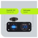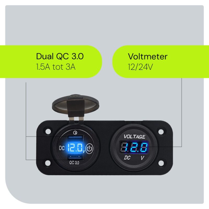 ProRide 12V USB Autolader 2 Poorten Inbouw met Schakelaar en Voltmeter – QC3.0 – Tweevoudig inbouw paneel – Blauw