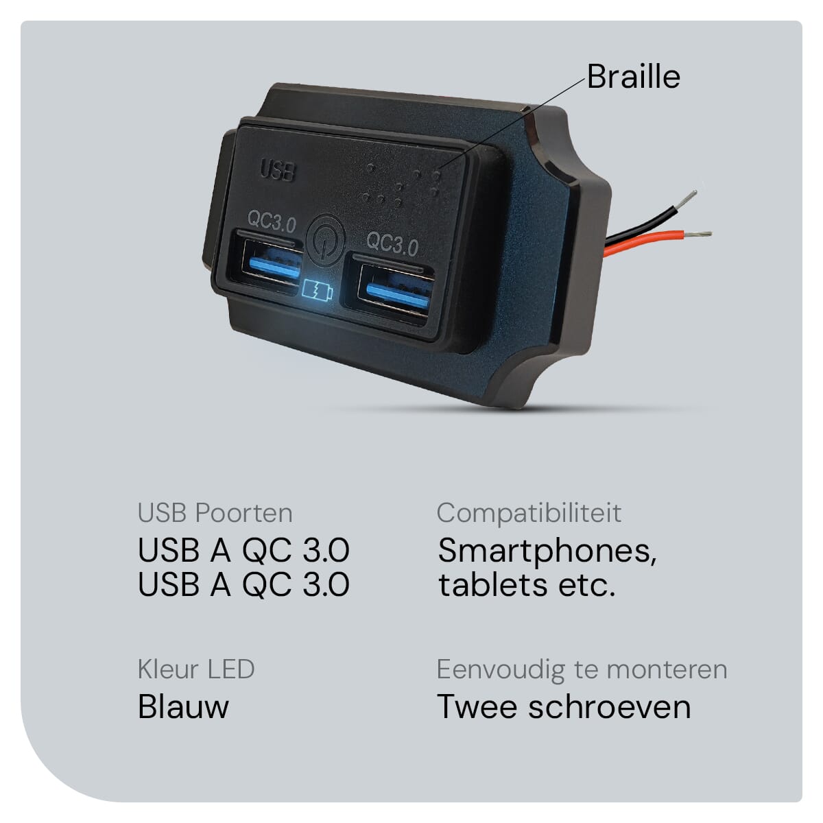 ProRide 12V USB Autolader 2 Poorten Opbouw met Braille en Afdekklepje