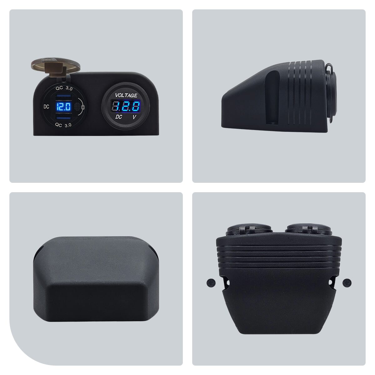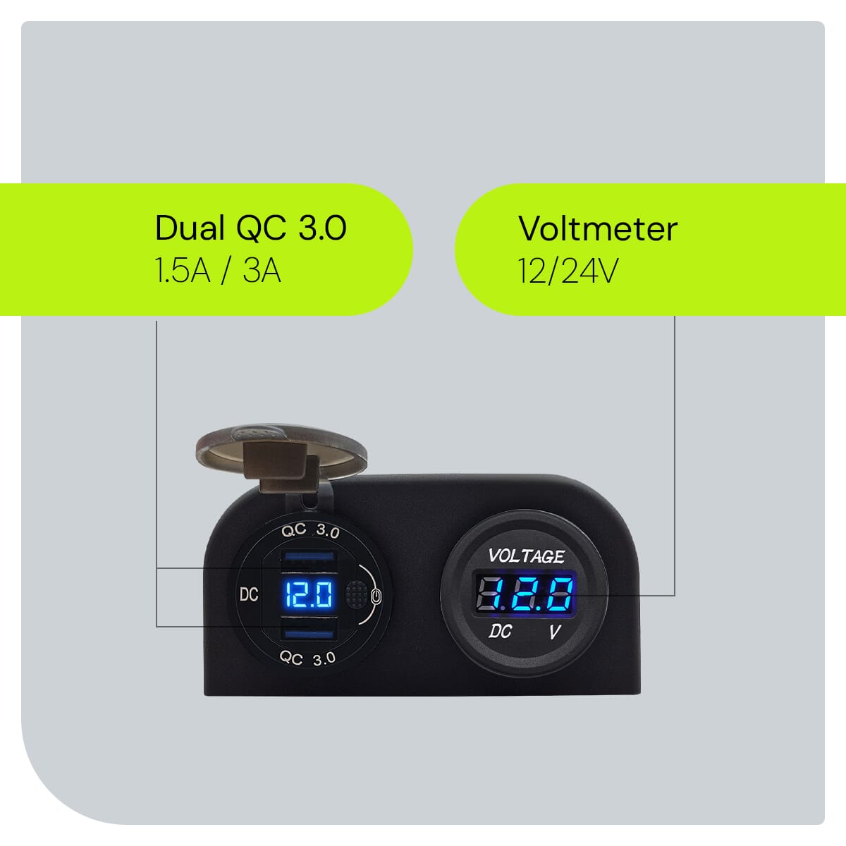 ProRide 12V USB Autolader 2 Poorten Opbouw met Schakelaar – QC3.0 – DS2120B – Tweevoudig opbouw met Voltmeter – Blauw