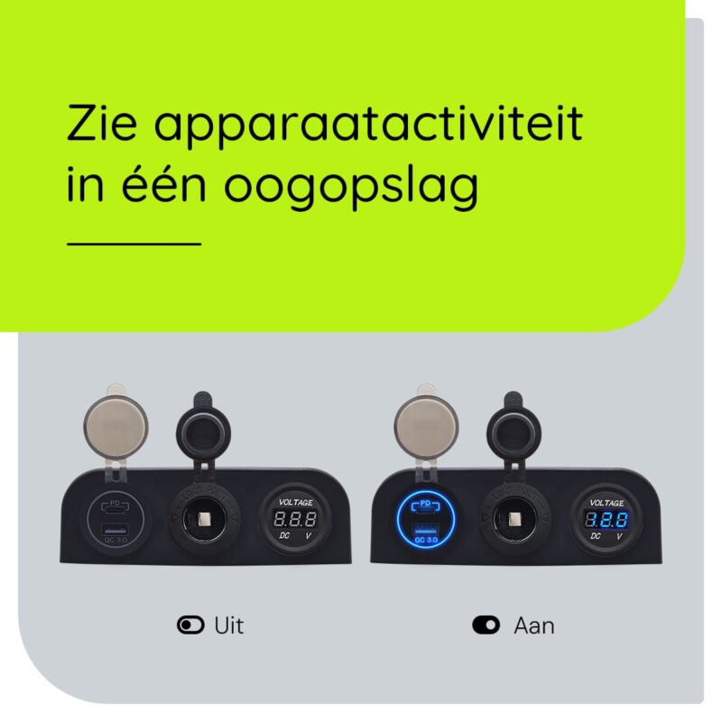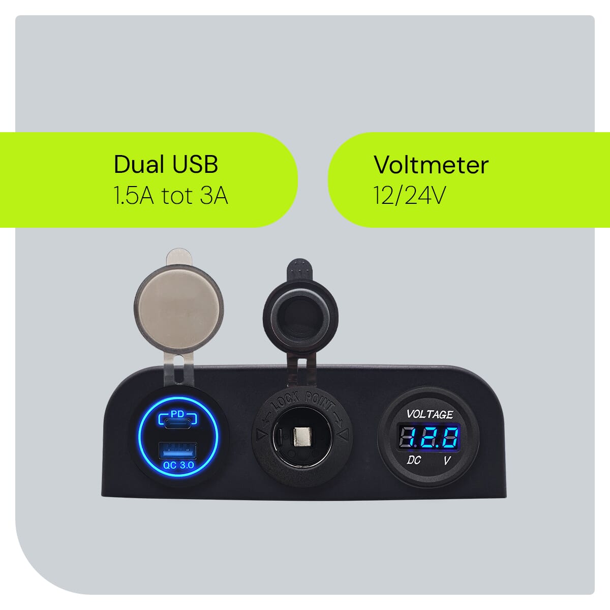 - Extra’s: Voltmeter en 12V/24V sigaretten stopcontact