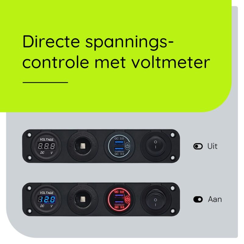 - Extra’s: Aan/Uit schakelaar, Voltmeter en 12V/24V sigaretten stopcontact