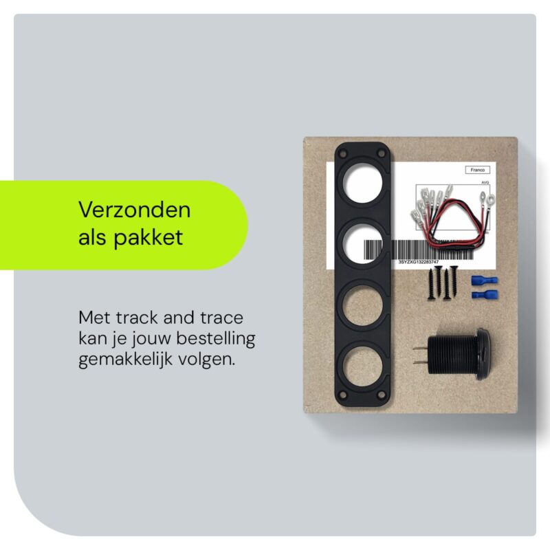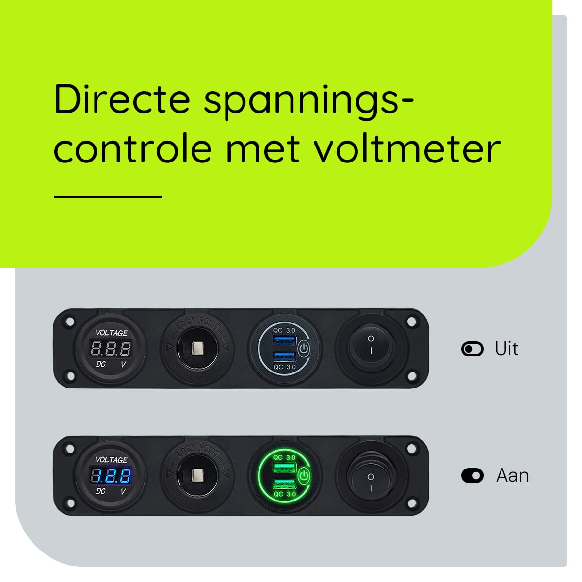 - Extra’s: Aan/Uit schakelaar, Voltmeter en 12V/24V sigaretten stopcontact