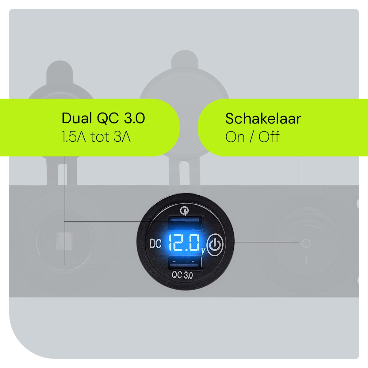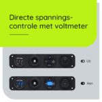 - Extra’s: Aan/Uit schakelaar, Voltmeter en 12V/24V sigaretten stopcontact