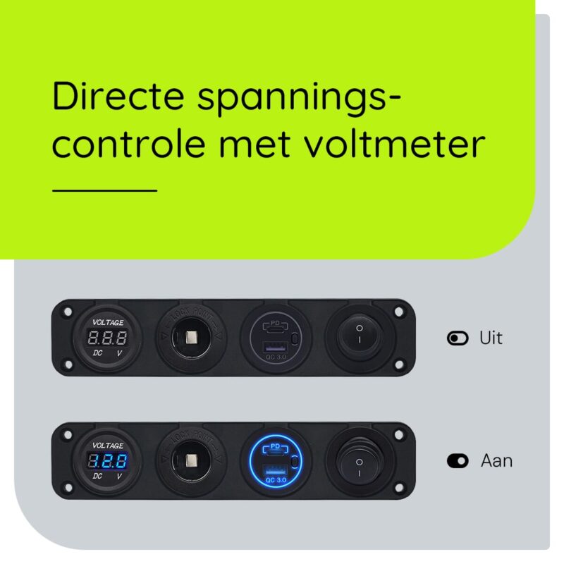 - Extra’s: Aan/Uit schakelaar, Voltmeter en 12V/24V sigaretten stopcontact