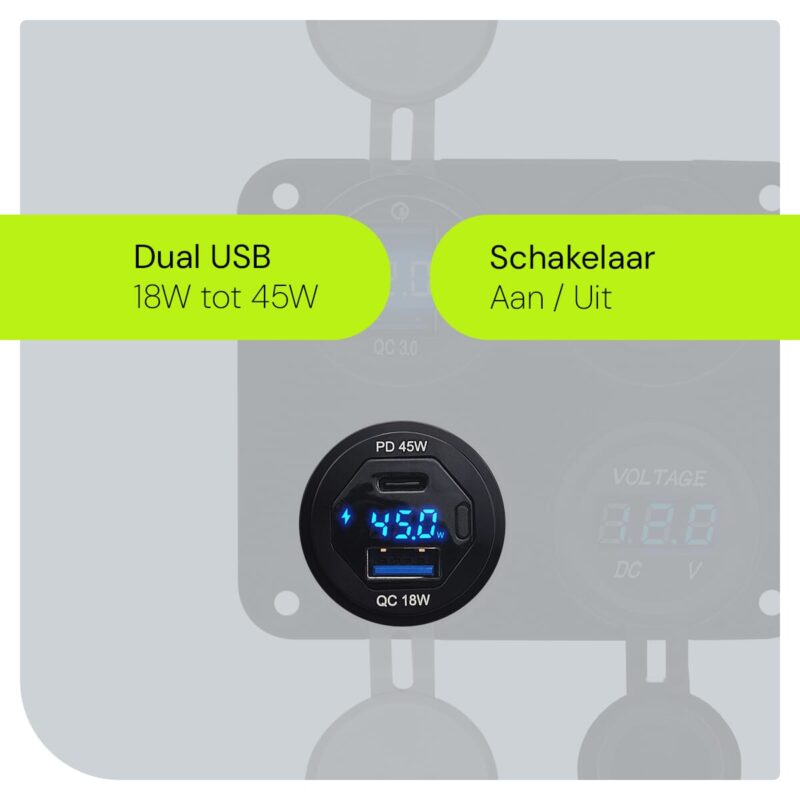 ProRide 12V USB Autolader 4 Poorten – 45W/QC3.0 – Voltmeter en Schakelaar – Vierkant inbouw