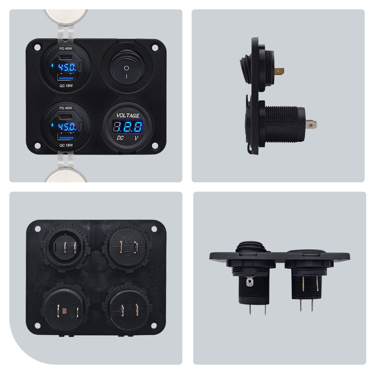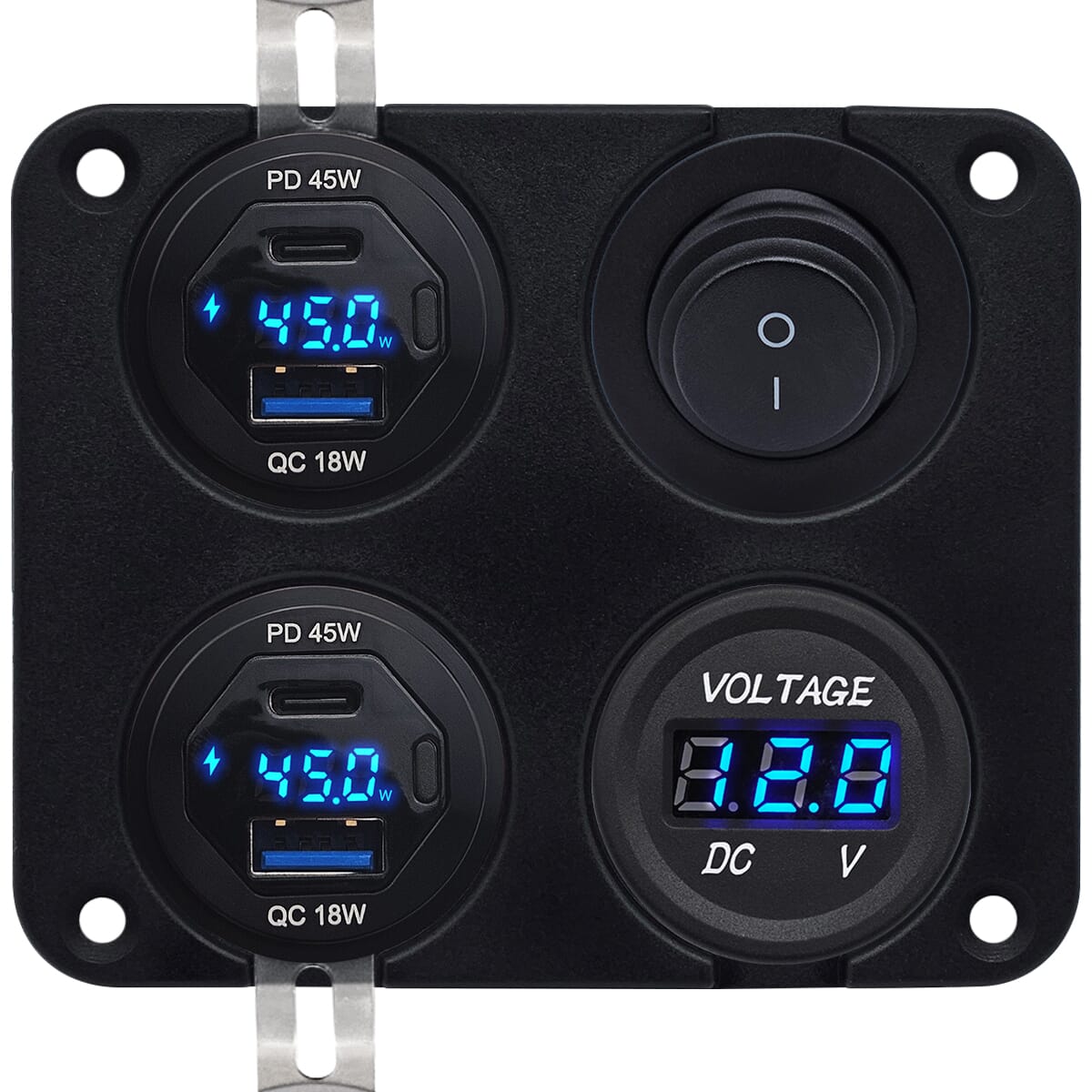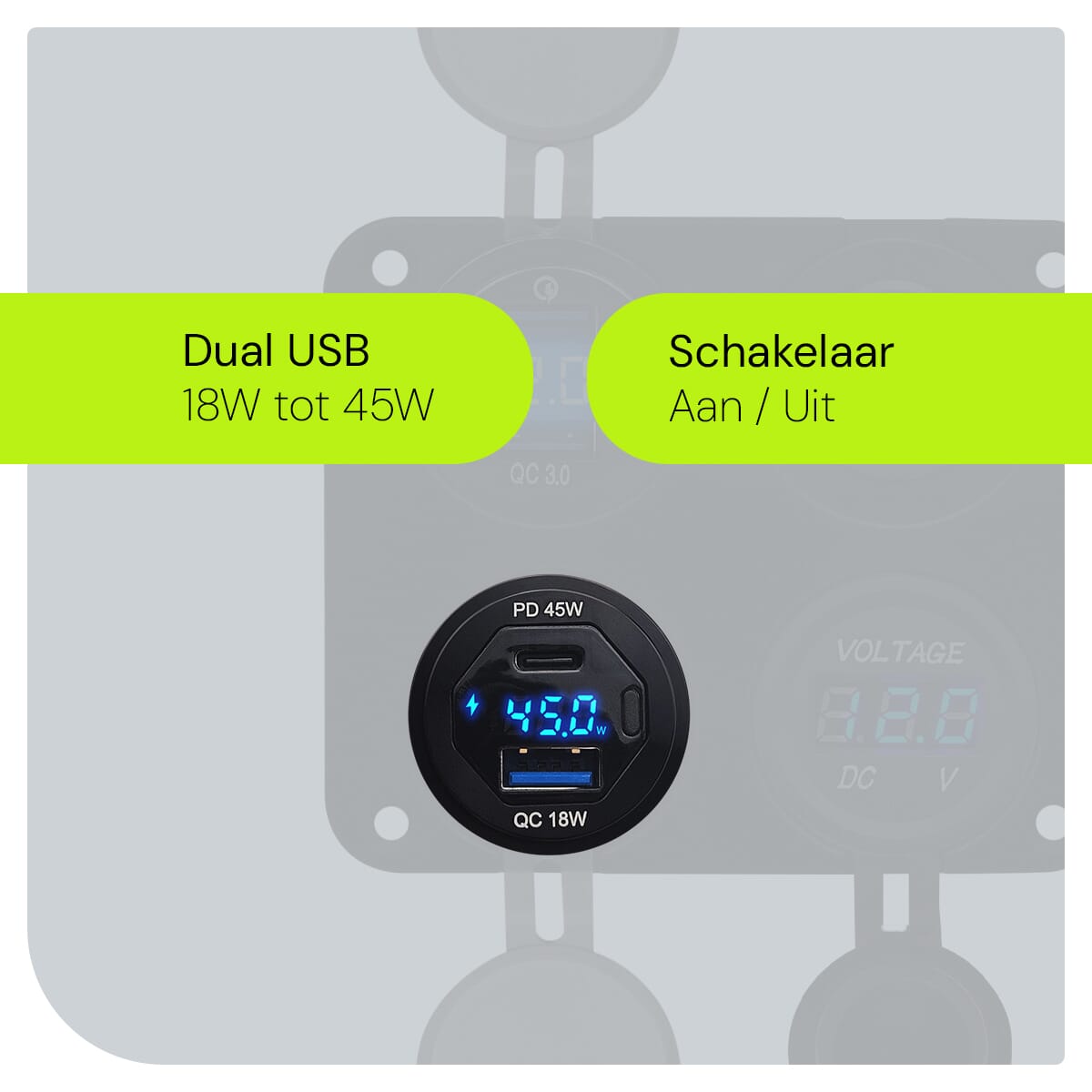ProRide 12V USB Autolader 4 Poorten – 45W/QC3.0 – Voltmeter en Schakelaar – Vierkant inbouw