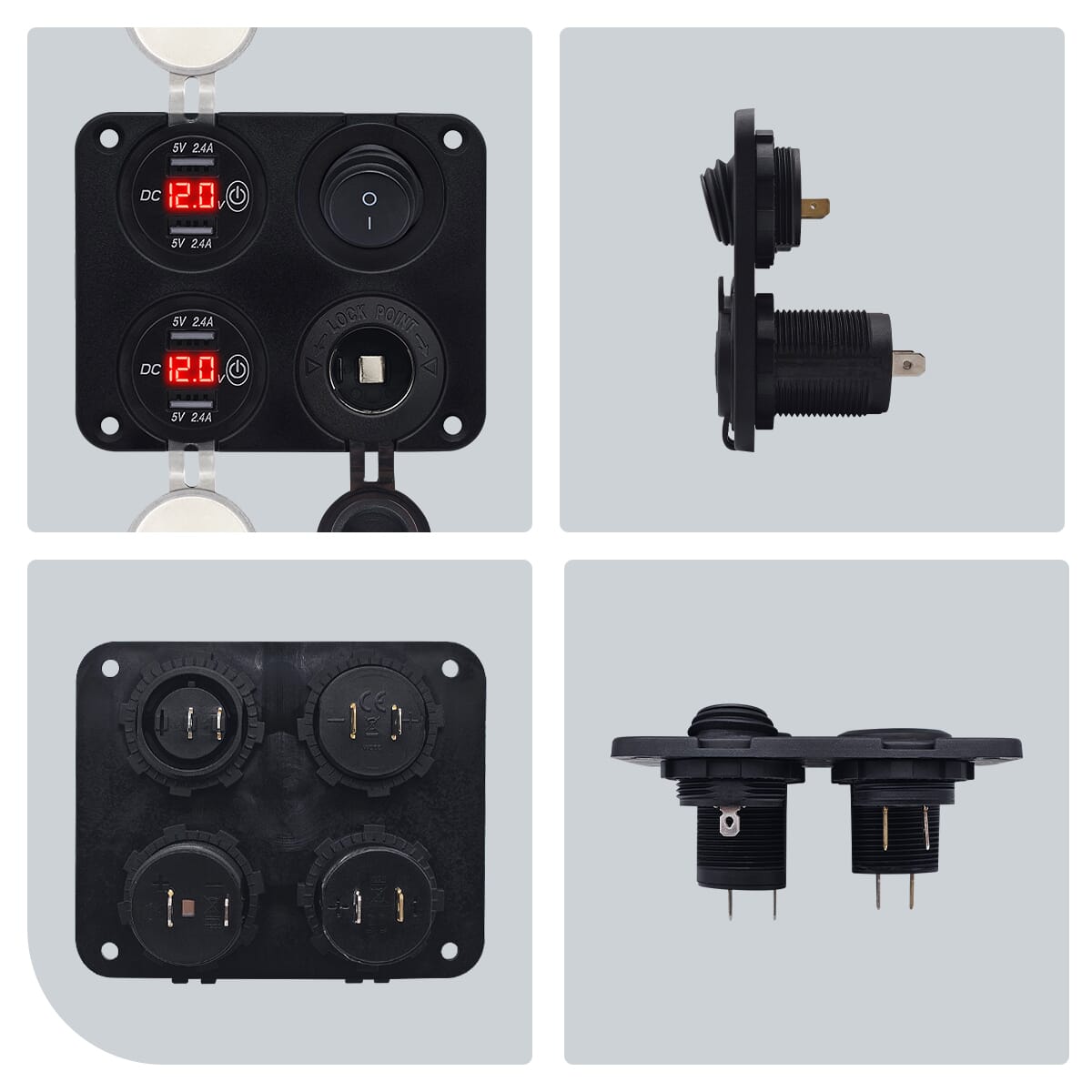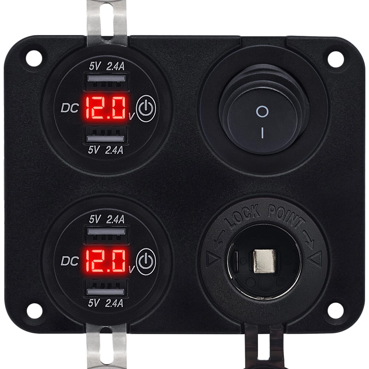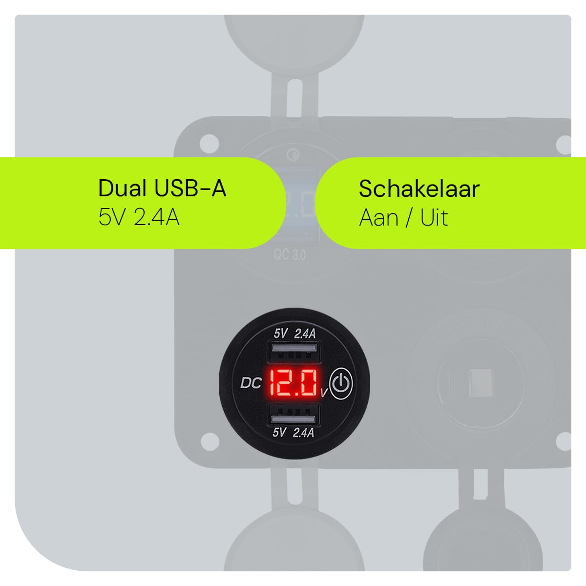 ProRide 12V USB Autolader 4 Poorten – 5V/2.4A – Schakelaar en 12V Sigaretten stopcontact – Vierkant inbouw