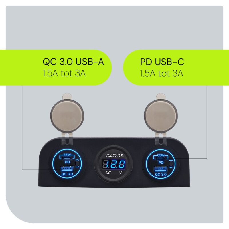 ProRide 12V USB Autolader 4 Poorten – 65W/QC3.0 – P19172 – Drievoudig opbouw met Voltmeter